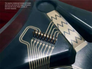 In summary, DuraTech Industries is using a new technology called in-mold electronics (IME) to print electronics on bendable plastic, which may replace traditional manual switches and switch boxes. The process involves printing electronics and decorations on a clear plastic substrate that is then molded to the part, creating a thin and flexible layer that is more water resistant.